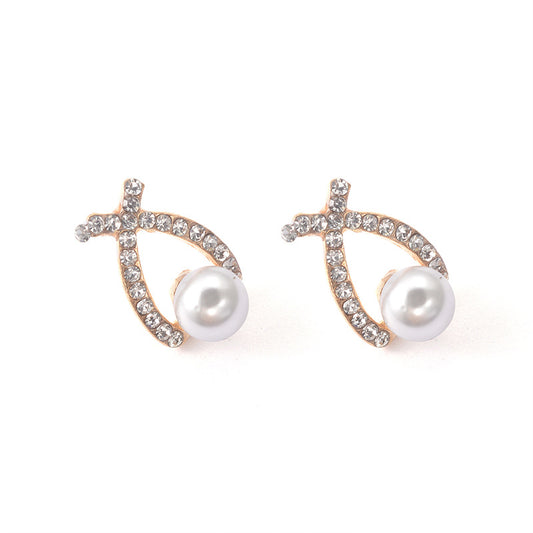 Cross Pearl Sparkling Diamond Stud Earrings Exquisite Fashion