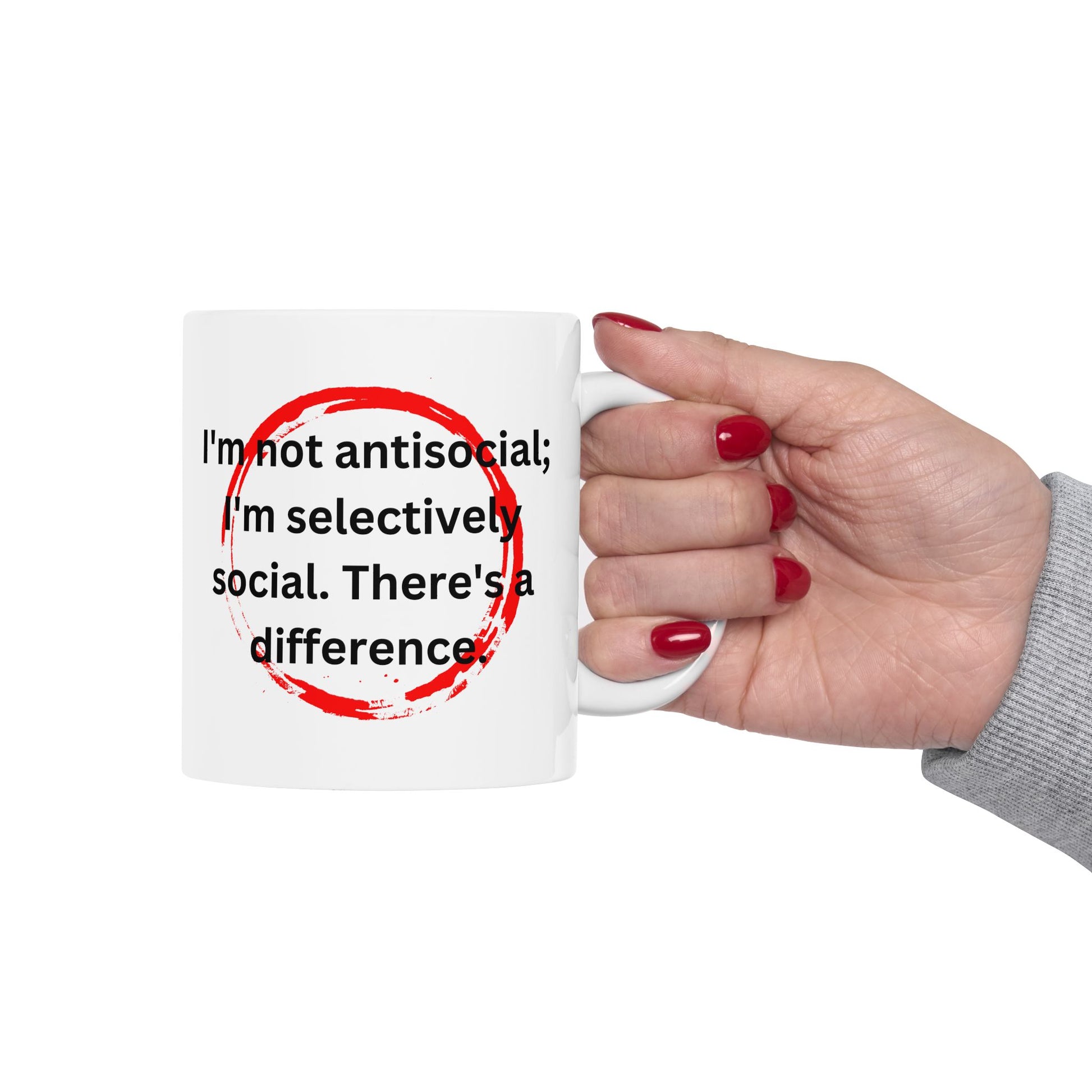 Express your witty side with our durable 11oz ceramic mug featuring the sarcastic message "I'm not antisocial, I'm selectively social." Perfect for coffee lovers and introverts alike. Makes a great gift!